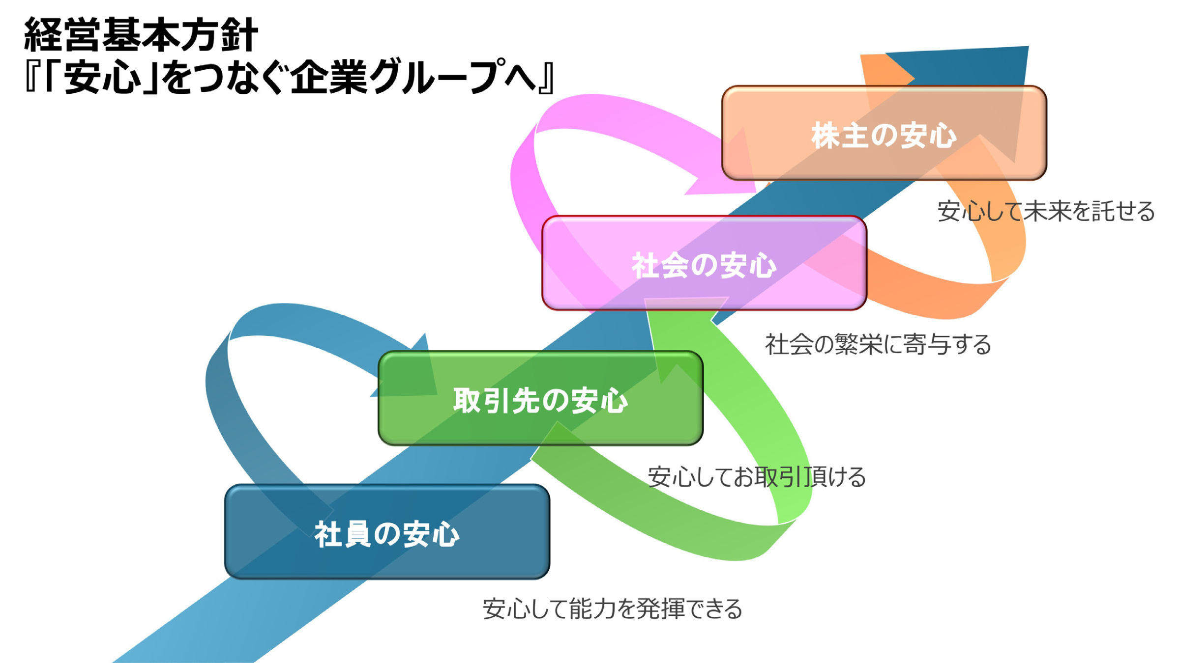 こうして実現されたトータルソリューションは、社会課題の解決に寄与し、社会からの信頼と評価を築いていきます。この信頼と評価の集積が、働きがいや安心感として社員に還元され、次の挑戦を後押しする力となります。