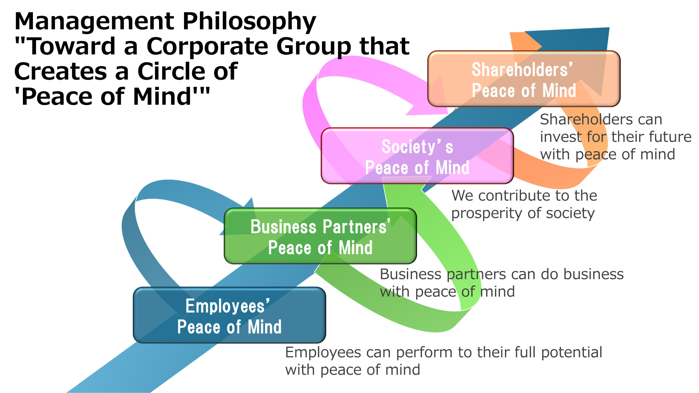 こうして実現されたトータルソリューションは、社会課題の解決に寄与し、社会からの信頼と評価を築いていきます。この信頼と評価の集積が、働きがいや安心感として社員に還元され、次の挑戦を後押しする力となります。